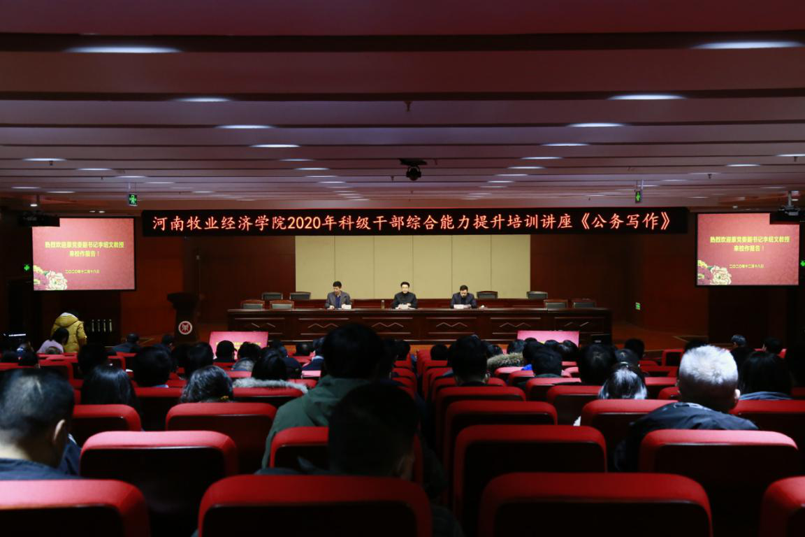 “为政之要,莫先于用人。”为提升学校科级干部的政治力、学习力、创新力、执行力,12月18日下午,学校2020年科级干部综合能力提升培训在龙子湖校区图书馆一楼报告厅正式启动,讲座由校党委副书记李波同志主持,原校党委副书记李绍文同志应邀作首场讲座《公务写作》,校党委组织部、离退休职工工作处等主要负责人及260名科级干部参加。