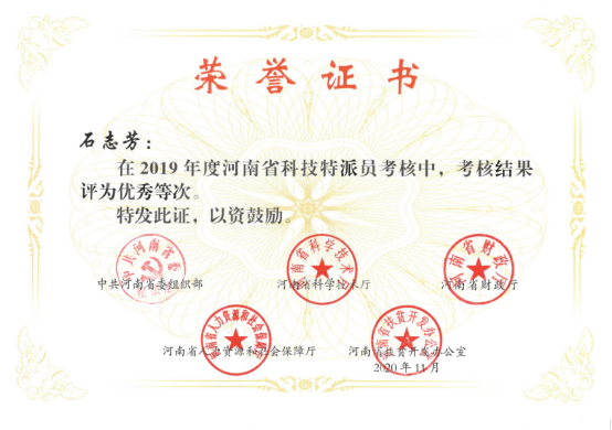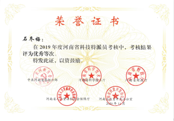 近日,河南省委组织部、省科学技术厅、河南省财政厅、河南省人力资源和社会保障厅、河南省扶贫开发办公室联合印发《关于公布2019年度河南省科技特派员考核结果的通知》(豫科〔2020〕144号),对2019年度河南省科技特派员进行考核,36365官网石冬梅、石志芳、韩启昊等3位教师荣获“河南省优秀科技特派员”考核等次。